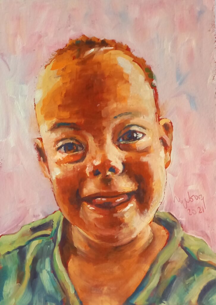 Hier enkele voorbeelden, waaronder een heel jong zelfportret. Gouache op papier, 50 x 70 cm