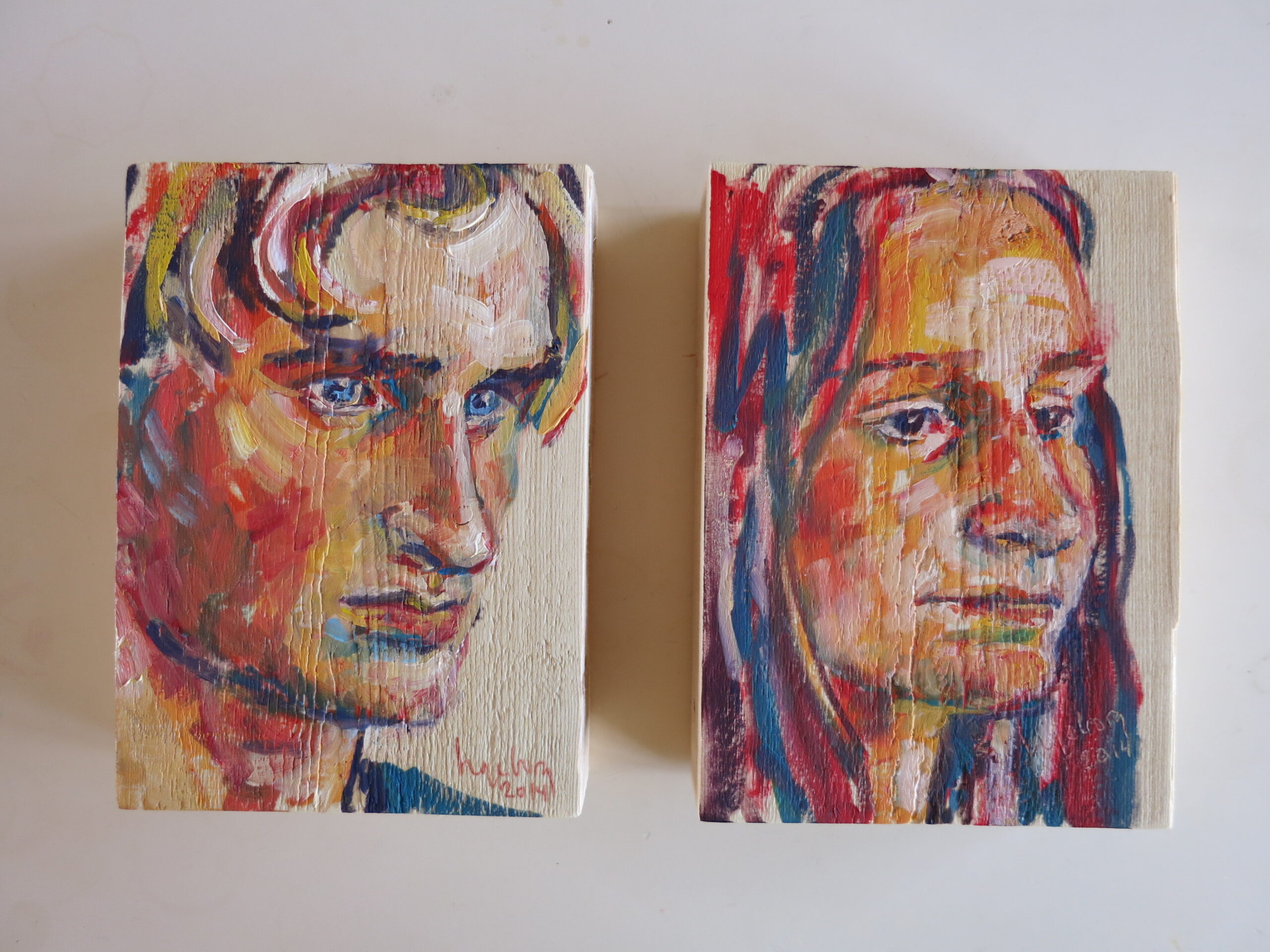 olieverf op dikke blokken hout, ca. 20 x 30 cm